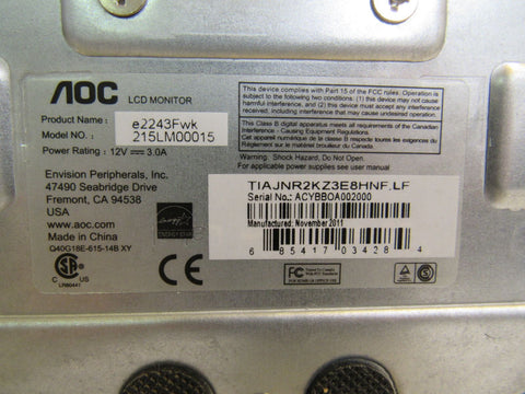 AOC LCD Monitor 21.5-in e2243Fwk Widescreen 215LM00015 -- Used