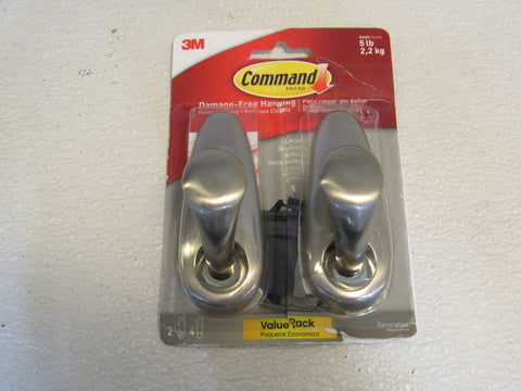 Command 3M Large Brushed Nickel Metal Hooks Set of 2 Holds 5-lbs Decorative -- New